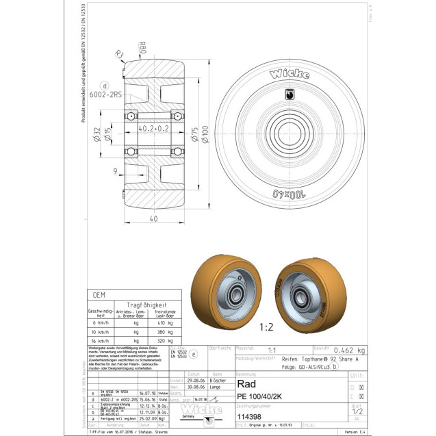 Wheel of the series PE are made of a one-piece aluminium die cast Wheel centre with a vulcanised polyurethane Wicke - Topthane® 92 Shore A tyre. The Topthane® tyre is bonded to the Wheel centre with a special bonding agent. The tyre is abrasion resistant with low starting and rolling resistance. The tyre is cut proof and has good tear strength. The Wheel are with ball bearings.